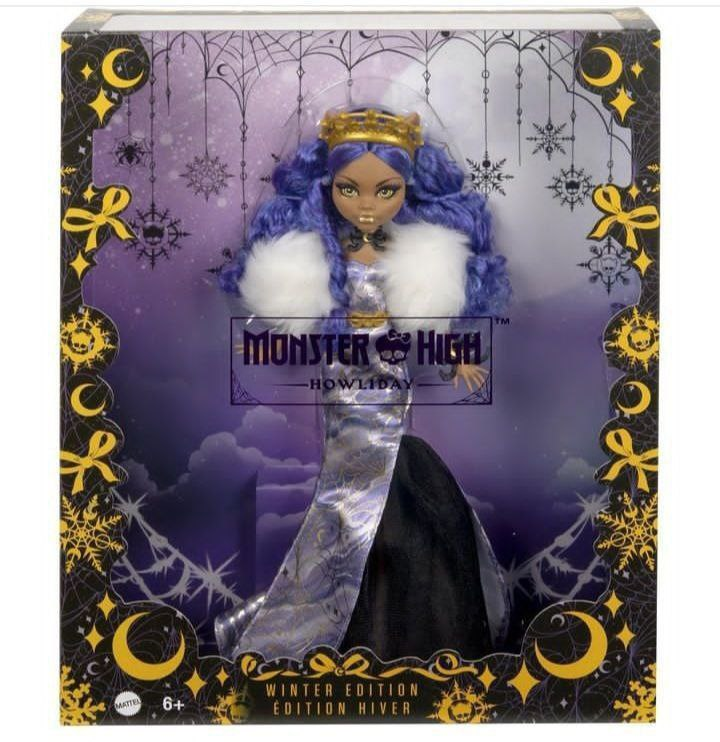 Наконец-то вышли качественные фотографии предстоящей куклы к Рождеству с Клодин Вульф. До этого была Дракулаура. Цена этой замечательной куколки будет - 45$. Рассмотрим ее более детально. Коробка нас перемещает в ночное небо с облаками и огромной луной. Коробку украшают желтые полумесяцы, паутины, снежинки с черепком Monster High, желтые звездочки, снежинки, бантики. У куклы, как по мне, очень красивое цветовое сочетание, которое ей явно идет и напоминает мне Клодин из коллекции "13 желаний". У нее красивые фиолетовые длинные локоны, у нее бо из искусственного белого меха, будто Снежная королева, красивое атласное фиолетовое платье с черной вставкой в пол, украшенное золотыми паутинками. На Клодин также кристальные сетчатые туфли. Личико очень симпатичное, макияж глаз у нее фиолетовый с золотым цветом и губы тоже золотые. На голове красуется красивая золотая корона со всеми фазами луны, а на шее черный бант с полумесяцем. Из аксессуаров у куклы также золотой пояс и браслет в виде банти