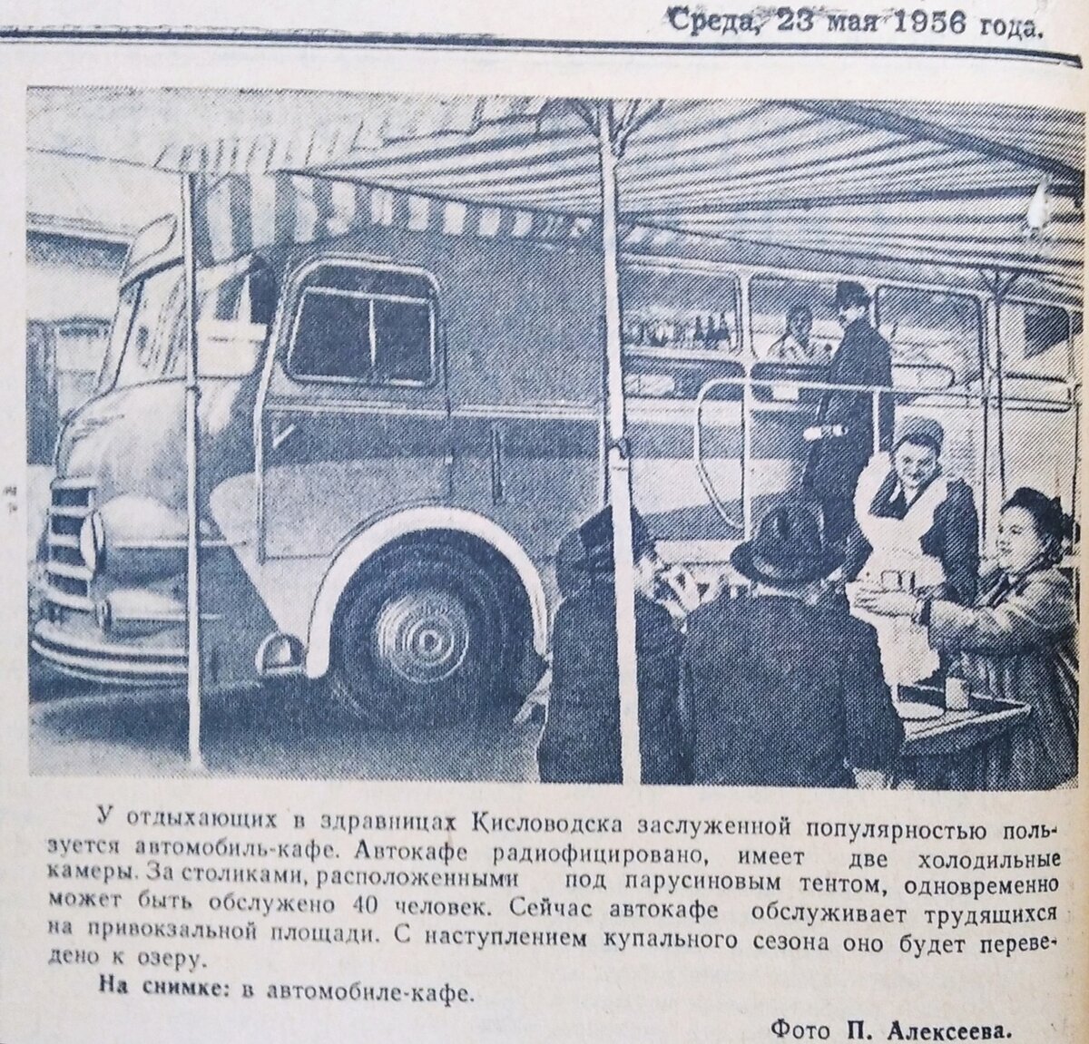 После публикации статьи о работе автобусов Австро-Фиат ÖAF 6DT-130 «Trambus» и передвижных кафе ÖAF 6DF-130, в которой говорилось о том, что общее число городов СССР, в которые в 1956 году поступили передвижные кафе ÖAF 6DF-130 пока неизвестно. Известны города: Ленинград, Рига, Сочи. И вот, благодаря работе Вадима Горбачева с газетными архивами, стало известно, что одно такое кафе весной 1956 поступило в город Кисловодск Ставропольского края. Ниже предлагаю вам заметку из газеты "Ставропольская Правда" от 23 мая 1956 года о работе ÖAF 6DF-130 на кисловодских улицах. В ней говорится, что кафе обслуживает посетителей на привокзальной площади города. За столиками под парусиновыми тентами может разместиться 40 человек. Автокафе радиофицировано и имеет две холодильные камеры. Статья, как всегда, кликабельна. Ещё раз спасибо Вадиму за находку! Основная статья: Автобусы Австро-Фиат в Советском Союзе, продолжение. Спасибо за внимание.
