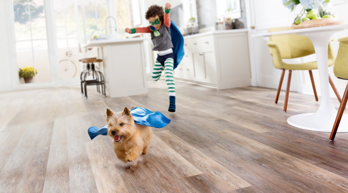 Ламинат – выбирайте с рельефом, чтобы пушистики не скользили и чувствовали себя устойчиво. Рельеф при беге не даст лапкам разъезжаться и пробуксовывать. Радостные, они будут носиться по полу с комфортом, а клацанье когтей и топот лап заглушит хорошая подложка. Позаботьтесь и о защите пола от влаги: выбирайте влагостойкий ламинат – он защитит ламели от разбухания, если питомец случайно опрокинет миску с водой или сходит мимо лотка. Влагостойкий рельефный ламинат неприхотлив в уходе, не боится царапин и пятен Кварц-виниловый ламинат – лучший вариант. В отличие от кафеля кварц-виниловый пол тёплый – четвероногим друзьям будет комфортно валяться на полу. SPC ламинат хорошо