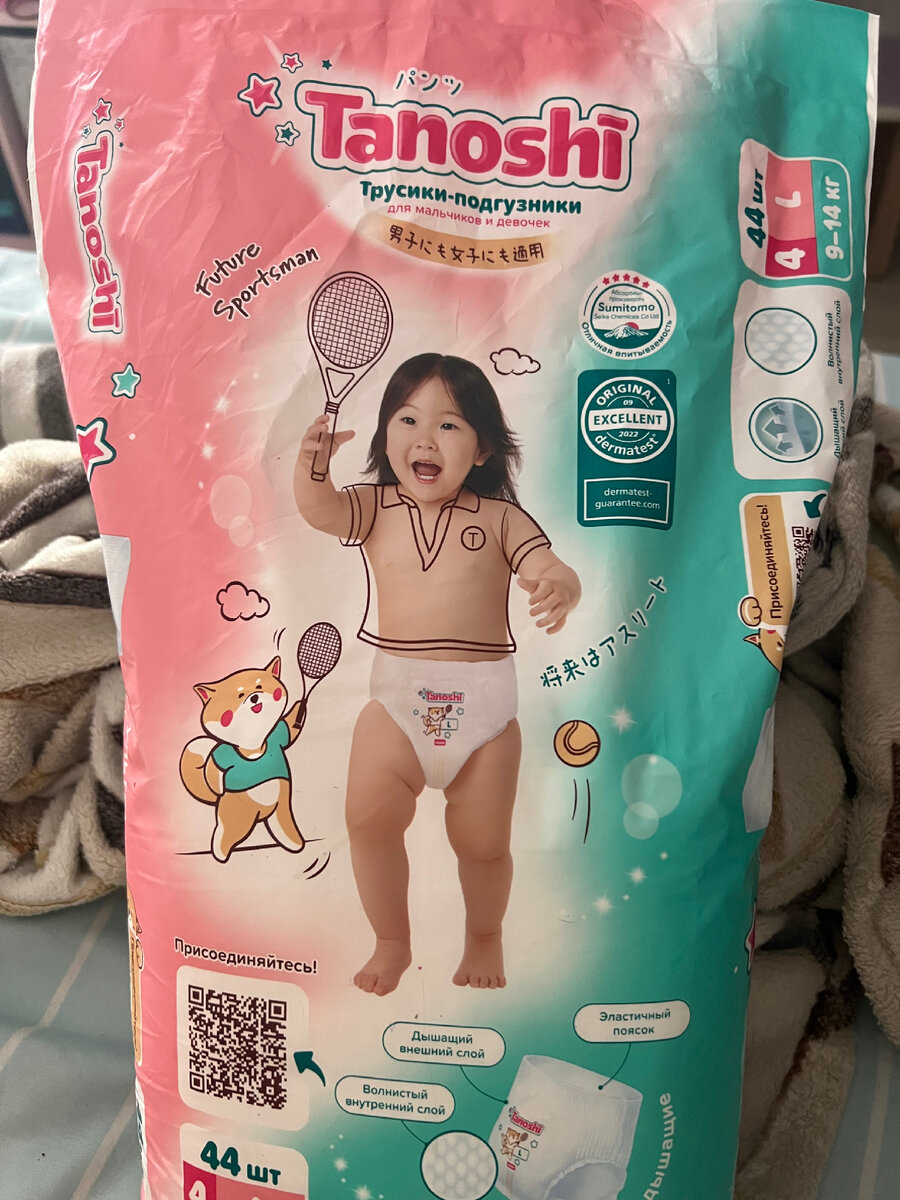 С момента рождения детей а у меня их трое, я перепробовала множество разных подгузников и подгузников-трусиков. От обычных подгузников мы отказывались когда ребенку исполнялось 4 месяца. Одевать подгузник было неудобно, и к тому же очень часто он при ползании на полу съезжал с малыша вниз. Со временем я поняла какие марки подгузников-трусиков более удобны для малыша. Эти марки Nishomi и Tanoshi Обычно покупаю что-то одно исходя из цены или скидок. Сегодня хочу рассказать о марке Tanoshi . Используем не так давно но нам уже очень нравятся. В данный момент мы используем L это весовая категория 9-14 кг. Вес ребенка 10 кг. Сидят идеально, не малы, не велики. С верхней стороны есть полупрозрачная ручка, удобно переносить подгузники-трусики из магазина без лишних пакетов. Упаковка 44 шт. В среднем нам хватает ее почти на месяц.Чем больше размер, тем меньше подгузников-трусиков в пачке. К сожалению цена от этого меньше не становится. Подгузники-трусики очень тонкие и легкие. Они хорош