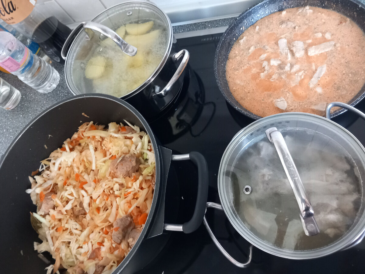 Приветствую всех читателей! Ломаете голову, что приготовить, чтоб вкусно накормить семью ? Делюсь идеями на каждый день ! Плита кипит! Сегодня на работу в ресторан, готовлю сразу и обед и ужин. Суп куриный с лапшичкой, капуста тушёная со свиной вырезкой, гуляш и пюрешка! Салат свежий: капуста ( тонкой соломкой), помидор ( средним кубиком) , чеснок +майонез 😋 ( можно ещё лук добавить по желанию) , свежо, сочно , вкусно! Вчера готовила пиццу, пышки ( дети любят с клубничным вареньем и холодным молоком), борщ, жарила окуня и стейки на ужин. Порезала свиную шею, отбила, посолила, поперчила и обжарила в сдух сторон на сковороде. Очень просто и очень вкусно. Замариновала лук ( соль, перец , капля уксуса) и порезала свежий огурчик с грядки😋. Любите и радуйте своих родных и близких ❤️❤️! Всем Ангела за трапезой!