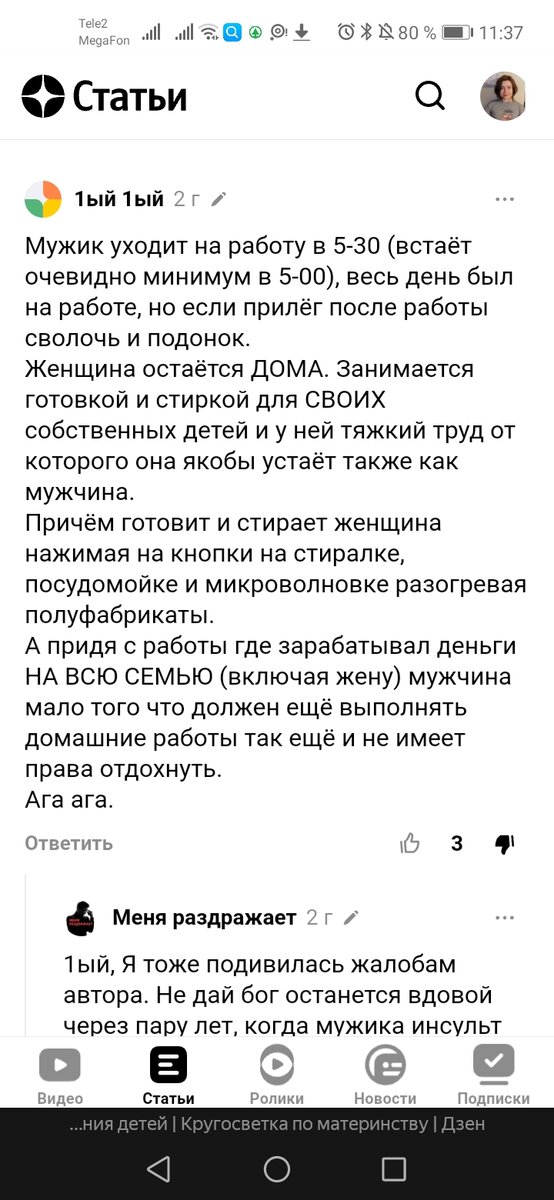 Интересно, а все мужчины считают, что декрет - это отпуск и женщина ничего не делает, она ведь дома сидит? А что это за чудо-стиралки, микроволновки и посудомойки, которые сами всё делают без участия человека? Даже если всё это есть, кто-то же будет всё складывать, раскладывать, убирать на свои места. Почему женщина не устаёт от готовки, уборки и "слежки за детьми", а мужчина от работы устаёт? У работы есть график, у декрета графика нет. Моему младшему ребёнку девять месяцев и он до сих пор плохо спит (он спит только в обнимку со мной) сегодня в пять утра я смела встать и оставить его с папой, сын стал плакать и высказывать своё недовольство. Вряд ли, находясь на работе, мужчина спрашивает разрешение чтобы покинуть рабочее место и пойти в water closet. Даже если работа режимная, то по расписанию есть время, когда можно встать со своего рабочего места и пойти на обед или в туалет. Вернёмся к тому "мужчина работает, а женщина отдыхает". Женщина до декрета тоже работала, но вряд ли,
