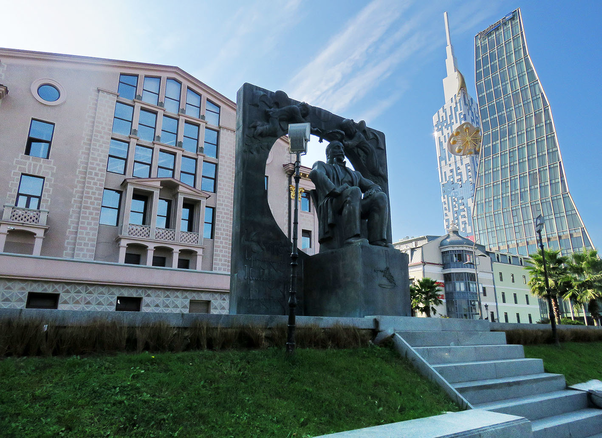 За его спиной - Батумский драмтеатр имени Чавчавадзе, фасадом выходящий на Театральную площадь. Над ней висят 35-этажная Батумская башня (2012, 205м), после 8 лет бесхозности да накануне ковидного локдауна отданная пятизвёздочному отелю "Ле Мередиан", отель "Рэдиссон-Блю" в характерным ломанным фасадом и элитный 43-этажный ЖК "Порта-Батуми" (2016, 165м).