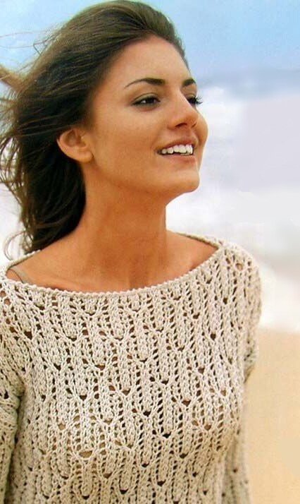 Размеры: 34/36 (38/40)42/44 Вам потребуется: 》 Пряжа: 400 (450) 500 г. светло-серой пряжи (96% хлопка, 4% эластана, 100 м/50 г); 》 спицы № 4 и №4,5; 》 крючок № 4. Ажурный узор Число петель кратно 10 = 6 = 2 кром. Вязать по схеме, на которой приведены только лиц. р., в изн. р. петли и накиды вязать изн., 2 накида подряд провязывать 1 изн. и 1 лиц. Начать с 1 кром. и петли перед раппортом, повторять раппорт, закончить петлями после раппопорта и 1 кром. Повторить 1 раз с 1-го по 20-й р., затем повторять с 5-го по 20-й р. Плотность вязания 21 п. и 25 р. = 10 х 10 см. Спинка/перед На спицы №4 набрать 98 (108) 118 п. и связать 1 изн. р. лицевыми. Этот ряд не учитывается при дальнейшем счете. Затем перейти на спицы № 4,5 и вязать ажурным узором. Через 53 см = 132 р. (56 см = 140 р.) 59 см = 148 р. от наборного края все петли закрыть, при этом средние 28 см образуют вырез горловины, внешние 9,5 (11,5) 14 см с каждой стороны — плечи. Рукава На спицы №4 набрать 68 (68) 78 п.