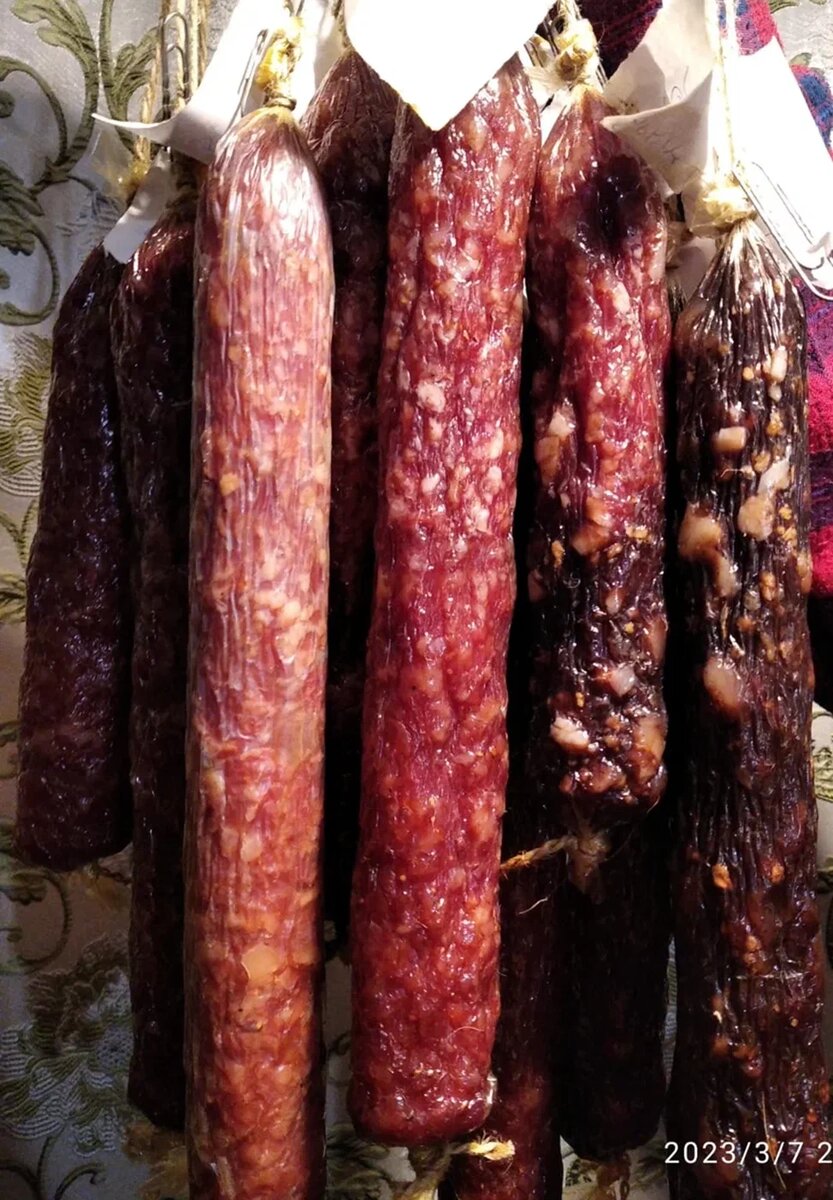 Данная сырокопчёная колбаса сделана двадцать дней назад. Колбаски я обычно в процессе увялки копчу дважды по семь минут. На десятый день, а также на двадцатый. Провожу контрольное взвешивание. Как правило увялка бывает где-то в районе 25-28%. Каково же было моё удивление при взвешивании этой партии, все кроме одного батона показали около 40%. Однако... Удивление сменилось огорчением, закал пошёл. На Сальчичоне в меньшей степени, свинина однако, а говядина более чётко его показывает. Вкус отменный, а качество печалит. Не привык я к такому. Опыт был приобретён в трёхлетний период проживания на ферме, где условия для сыровяленых колбас были созданы оптимальные, на новом месте пока таких создать не удалось, низкую влажность не победил. К осени всё наладим. Кстати есть один любопытный момент. Один батон в оболочке Айцел показал 27% т.е. идёт по обычному графику, а НалоФерм не простил не сложных условий сушки. Вот такой опыт. Подписывайтесь на канал, буду делиться как успехами так и неудача