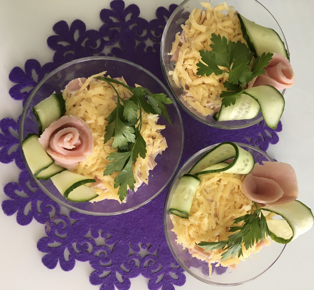 Такое блюдо подойдёт и на праздничный стол, так как выглядит эффектно, и на обычный ужин, так как сделать его несложно. На 3 порции понадобятся: 3 свежих огурца, 3 яйца, 200 грамм ветчины, 200 грамм сыра, майонез, зелень. В креманку положить нарезанные кубиками: первый слой огурцы, второй слой варёное яйцо, третий слой- ветчину. Каждый слой промазать майонезом. Посыпать тёртым сыром, украсить и добавить зелень. Салат готов, приятного аппетита! @Повар на скорую руку 🧑🍳