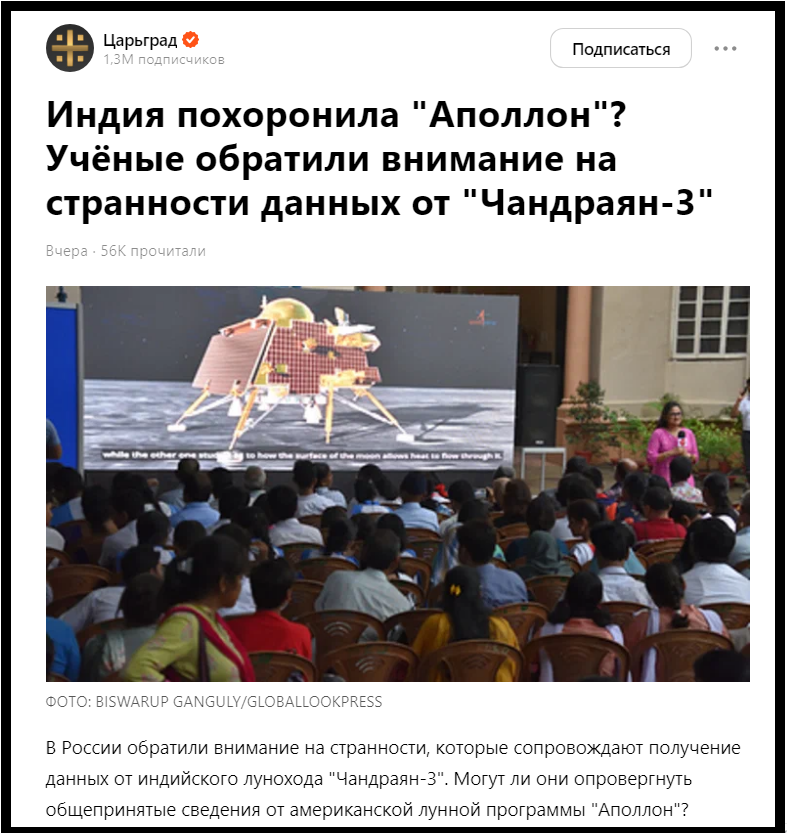 Как известно, популярный персонаж советских анекдотов - Вовочка, когда глядел на кирпич, думал о женщинах. Почему? А потому что он всегда о них думал. Возраст такой. А о чем думают российские конспирологи (они же немоглики), когда происходит какое-то событие в области космонавтики? Они думают об американских астронавтах, которые (по их глубокому убеждению) ни на какую Луну не летали. Вот и канал Царьград вдруг перепостил материал Родины Слонов. Почему? А потому что Царьград тоже всегда думает об астронавтах (которые по мнению Царьграда никуда не летали), когда происходит что-то космическое. Вы правильно поняли. Что бы не произошло - астронавты на Луне не Были!!! НИЛИТАЛИ!!! Сел на Луну китайский корабль, запустил луноход - появились сонмы публикаций на тему: "луноход не нашел следов астронавтов на Луне!" А то, что астронавты садились на видимой стороне, а китайский луноход ползает по обратной, оставляется за кадром. Главное заголовок. Именно его читает паства Царьграда и ему подобн
