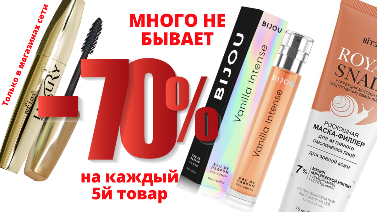 Акция во всех магазинах сети! Скидка на каждый пятый товар в чеке -70%! Действует до 17.09.23! ✔️ Спешите обновить косметичку новыми оттенками сезона! ✔️ Обновляйте свой уход на осень, чтобы кожа была готова к изменениям погоды! ✔️ Пополняйте свой парфюмерный гардероб, чем то вдохновляющим на самую поэтичную пору! Выбрать удобный магазин