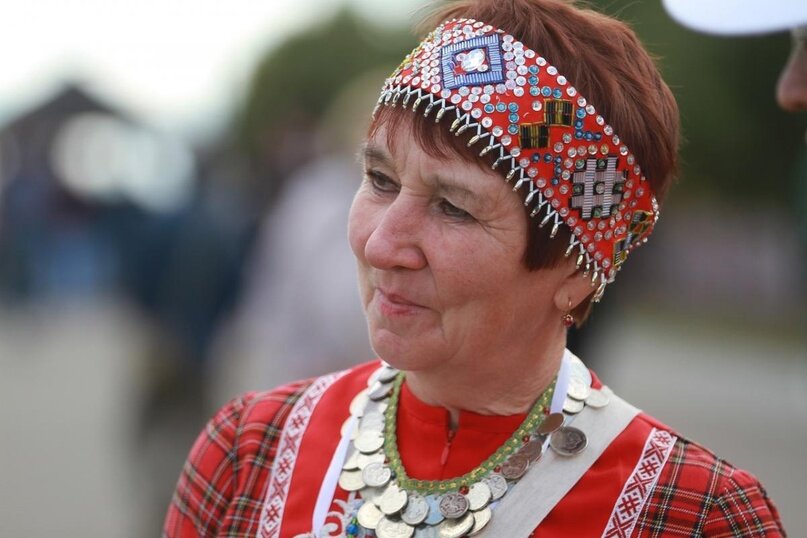 Главное отличие чувашского образа - огромное количество украшений. На голове Тамары Петровой красовался масмак - женская повязка с вышитыми узорами, на шее - монисто, или ожерелье из монет. По словам пары, раньше монеты в подобных украшениях были серебряные, но сейчас такие уже не делают.