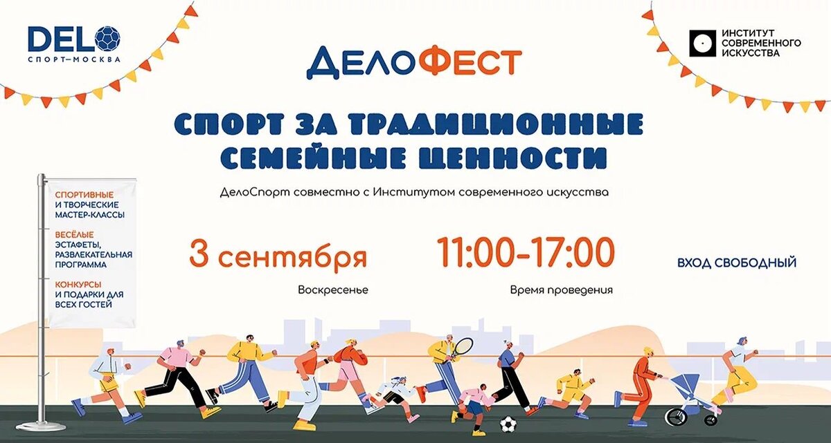 3 сентября с 11.00 до 17.00 на регбийном стадионе «Фили» под открытым небом пройдет «ДелоФест» – молодежно-семейный спортивный праздник «Спорт за традиционные семейные ценности». Организаторы фестиваля «Институт современного искусства» и команда «Дело Спорт» приглашают гостей фестиваля активно провести время с семьей и друзьями, принять участие в спортивных, культурно-развивающих и увеселительных мероприятиях праздника. В рамках фестиваля пройдут веселые эстафеты, спортивные мастер-классы по футболу, гандболу, регби, ракеточным видам спорта, йоге и др. Институт современного искусства проведет творческие и развивающие мастер-классы. В рамках развлекательной программы гостям фестиваля предлагается принять участие в лотереях, конкурсах и розыгрышах призов. Для молодых семей, многодетных семей и семей участников СВО вузы Консорциума «Новая площадь» подготовили специальные призы. А самых юных гостей ожидают увлекательная детская программа и вкусная зона с напитками и мороженым! Вход своб