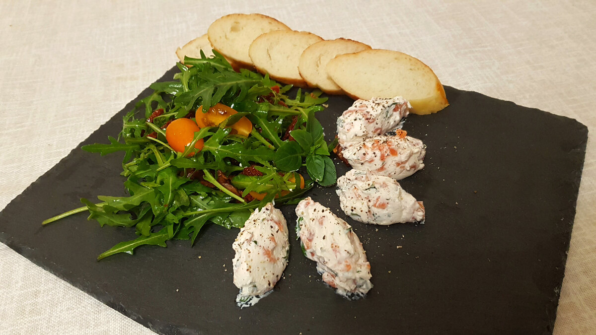 Форель нарезаем мелким кубиком, листья базилика мелкой соломкой и перемешиваем с творожным сыром. Формуем с помощью чайных ложек и выкладываем на тарелку вместе с салатом и ломтиками чиабатты. При подаче сыр посыпаем молотым перцем из мельницы.