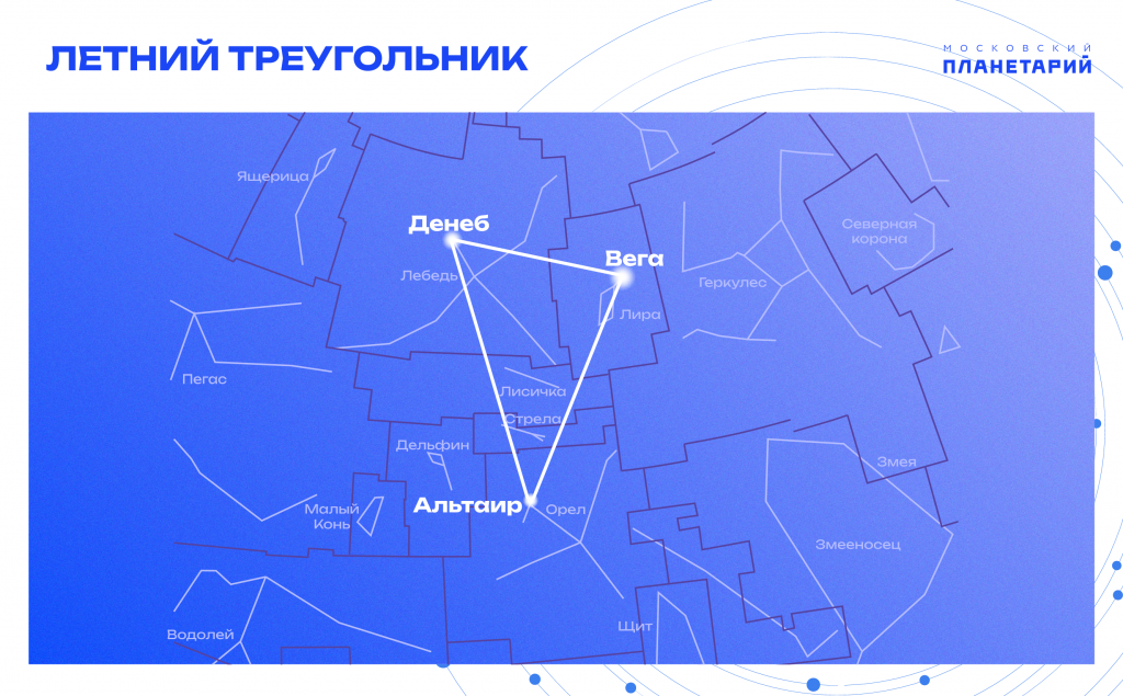 Высоко в западной и юго-западной областях неба легко заметить три звезды, образующие летне-осенний треугольник. Самая яркая из них – Вега (α созвездия Лира), левее виден Денеб (α созвездия Лебедь), а ниже, у горизонта, расположилась звезда Альтаир (α созвездия Орел). Левее Альтаира небольшое созвездие Дельфин, похожее на маленький ромбик с «ручкой», направленной вниз. Правее Веги созвездия Геркулес и Северная Корона, ниже раскинулись созвездия Змееносец и Змея. Над Геркулесом выделяется небольшая трапеция из четырех звезд среднего блеска, называемая Головой Дракона, так как служит началом созвездия Дракон. Практически над головой, около зенита расположилось созвездие Цефей, рядом с ним Кассиопея, от которой ниспадают на северо-восток, восток звёзды Персея. С северной стороны невысоко над горизонтом расположено созвездие Большая Медведица, а над ним — созвездие Малая Медведица. На северо-западе, севере легко найти Ковш Большой Медведицы, ручка которого указывает на звезду Арктур (α Воло