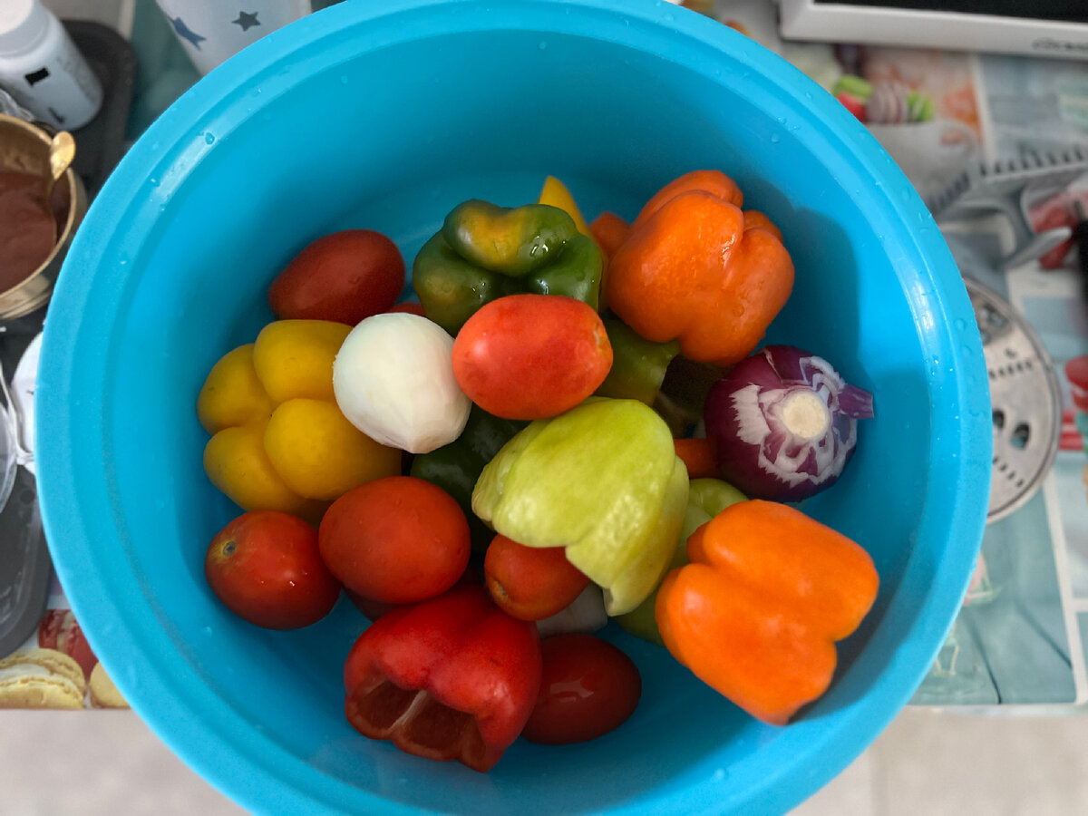 - Начистила и помыла овощи: перцы, баклажаны, кабачки, лук, морковь, укроп, помидоры, чеснок.