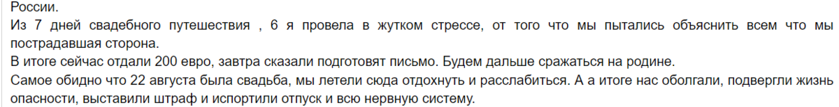 Мое мнение по этому поводу, мне конечно жаль пострадавших новобрачных, но есть несколько вопросов. В соцсетях развернулась бурная дискуссия. Свадьба состоялась 22 августа и сразу в свадебное путешествие, более романтичного и не придумаешь, и тут такое... вот скрин сообщения пострадавшей Начало истории от первого лица Туристы сразу отправили жалобу туроператору и получили официальный ответ: Сначала поговорим о туристах. Каковы их перспективы вернуть деньги и компенсацию за ущерб здоровью (если реально был и зафиксирован, как документально, так и фото-видео съемкой) и моральный вред. Что касается здоровья, надо было сразу звонить в страховую компанию и фиксировать страховой случай, если были какие-то затраты, то должны компенсировать, при условии , если турист не был не в адекватном состоянии (пьяный или под препаратами). Только подтвержденные документально расходы Уже дома сначала надо написать досудебную претензию туроператору и получить ответ. Судя по тому, как Анекс ответил на жало