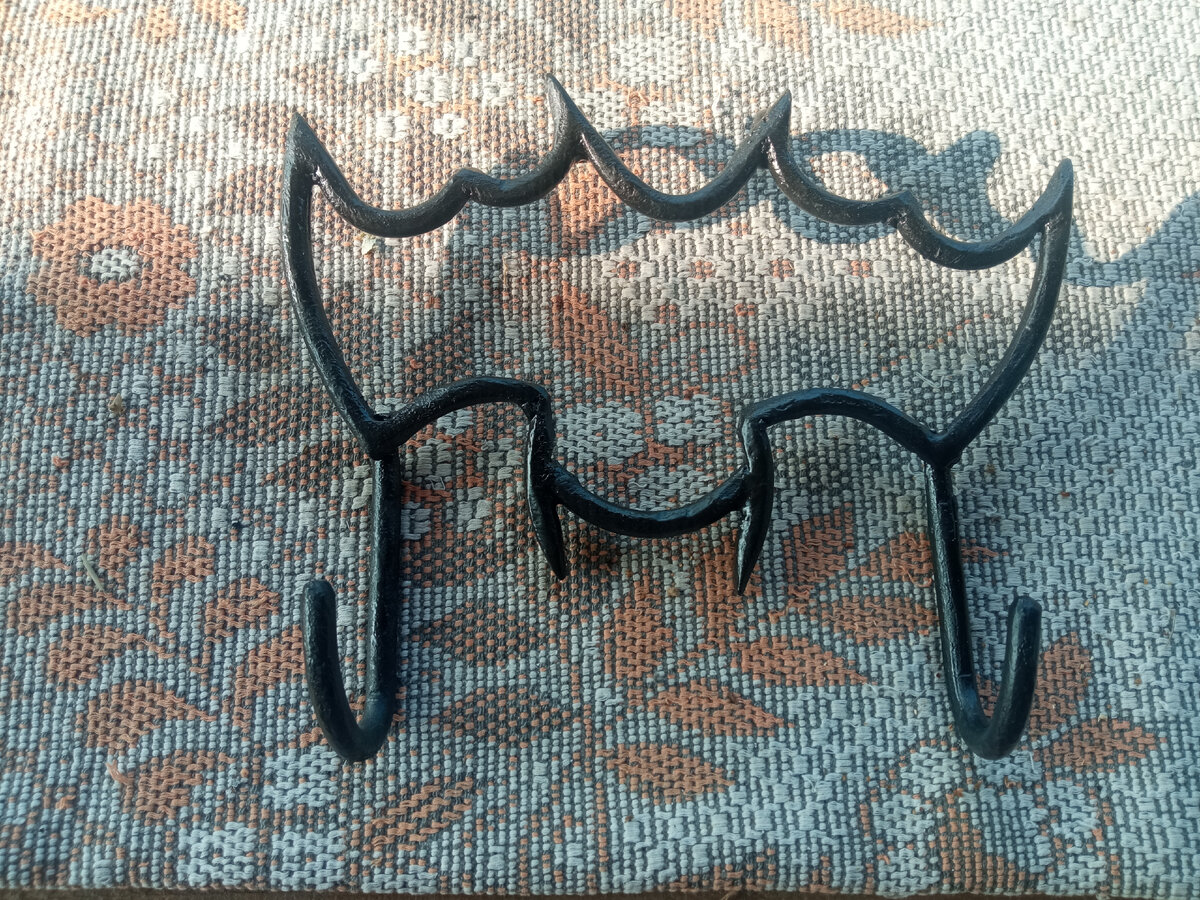 Приходит ко мне как-то Муза. Помятая такая, взъерошенная. Почëсывается, зевает... И говорит: - Давай, делай вешалку. А я на расслабоне - ночная смена, станки гудят, фрезы монотонно жужжат. Как говорится: "шпиндель крутится - бабло мутится". - Какую вешалку? - Ну в бане у тебя интерьер новый, а вешалка для полотенец старая. А надо что-нибудь интересное, брутальное. В сочетании дерева и чёрного металла! Делать нечего, стал придумывать. Конструкция должна быть ажурной, но при этом надёжной - банные полотенца и халаты весят не мало. Вышел на улицу покурить. Вокруг тьма кромешная, ночь всё таки. И вот в этой тьме и привиделись мне сначала летучие мышки в центре, а потом и паутины по краям. А затем, всё это сложилось в единое целое. Сначала в фантазии, а потом на монтажном столе. Мой любимый материал для творчества: стальная проволока диаметром 8 мм. Легко гнётся и формуется руками и молотком, без каких либо специальных инструментов. Сварочный аппарат с тонкими электродами и индукцион
