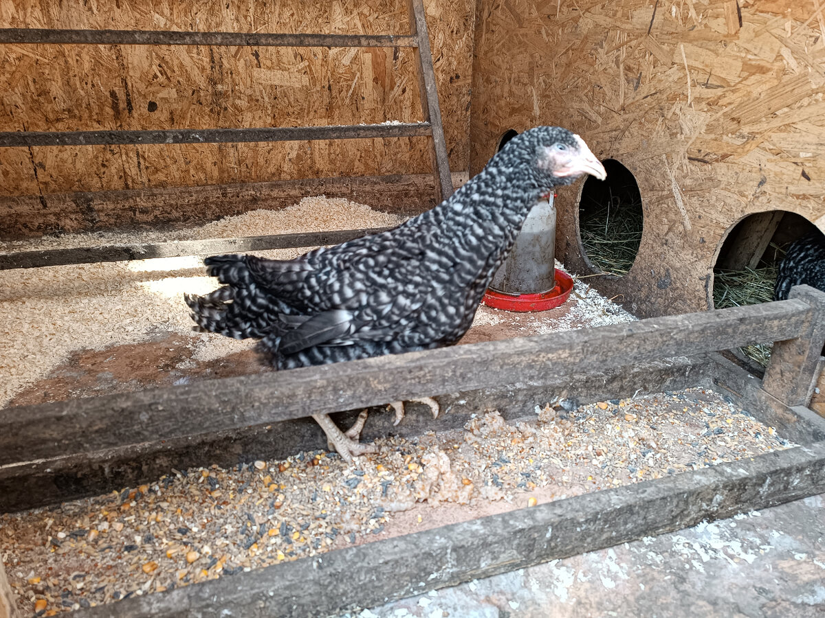 Здравствуйте статья пригодится для тех кто интерисуется разведением кур и непосредственно для тех кто этим делом занимается. В нашем хозяйстве имеется 10 куриц. 5 белых и 5 коричневых, породы Хай Секс. Это яйценосная порода. Выведена для несения яиц. Через год решили добавить в курятник курочку породы Доминант. Об этом данная статья. Купили в середине апреля цыплёнка 3 месячным. Старшие курицы стали клевать цыплёнка. Заходил в гнездо и там прятался от них. Пришлось отселить. Жил какое-то время в теплице. Поставили ящик с сеном, поилку, кормушку. Сделали жердочку. Птичка спокойная. Подходит сама. Даёт себя погладить. В теплице нужно сажать рассаду. Пришлось сделать пристройку к курятнику с отдельными входом для птенца. Здесь он в безопасности. Шло время цыплёнок подрастал. Переодически выпускали в огород. В отличие от других кур, крапчатый Доминант ест мало. Растения после его прогулки в огороде все целые. Клюёт зелень, но не фанатично, как это делают другие. Со в