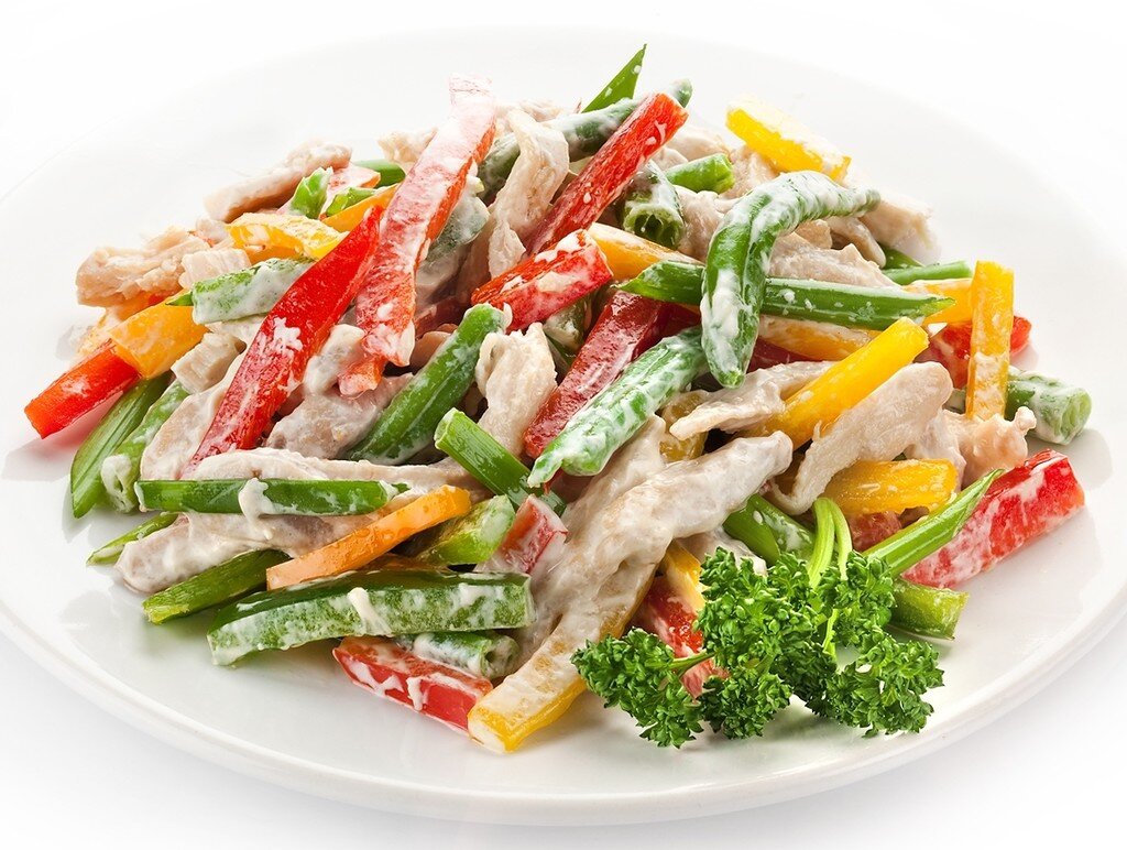 Ингредиенты: курица-200гр, перец красный сладкий (мясистый)-250гр, стручковая фасоль-200гр, яйцо куриное-3шт, майонез для заправки салата-4ст.л, чеснок-1 зубчик, растительное масло-4 ст.л, соль-по вкусу. Приготовление: Возьмите курицу (филе или окорочок), стручковую фасоль, сладкий красный мясистый перец, чеснок, растительное масло, куриное яйцо, майонез и соль. Сварите куриное мясо в солёной воде и остудите, ещё сварите в крутую яйца, также остудите их. Стручковую фасоль(у меня была замороженная) отварите 3 минуты в сильно солёной воде и погрузите на 30 секунд в холодную воду, потом фасоль откиньте на дуршлаг, пусть вся вода стечёт до последней капли. Сладкий перец нарежьте кубиками и обжарьте до мягкости с одним зубчиком чеснока(измельчить его) на растительном масле. Переложите перец с чесноком на тарелку-пусть остывает. Фасоль и кусочки мяса соедините в миске. Добавьте к ним яйца, нарезанные кубиками, и остывший перец. Всё заправьте майонезом, по вкусу можно добавить немного соли.