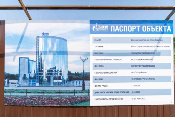 В г. Южно-Сахалинск ООО "Газпром добыча шельф Южно-Сахалинск" планирует возвести офисный многофукциональный комплекс, в который будет так же входить: сад, школа, ледовая арена и спортивно-оздоровительный центр. Комплекс был призван стать ярким ориентиром для жителей и посетителей города. Ожидается, что объекты введут в эксплуатацию в конце 2024 года Инвестиции составят - 1,39 млрд рублей. Он спроектирован в виде логотипа ПАО «Газпром», выполнен по радиальной схеме и функционально разделен на четыре блока: две офисные секции (17 и 11 этажей), спортивный блок с тренажерным залом и бассейном, блок подземной автостоянки с мойкой и служебными помещениями. В качестве подсветки запроектирована светодиодная программируемая система, позволяющая использовать фасад здания как огромный мультимедийный экран. Офисный комплекс определяет облик будущей деловой застройки городского района и привлекает новых инвесторов для развития региона и страны в целом. Контакты всех участников строительства здесь