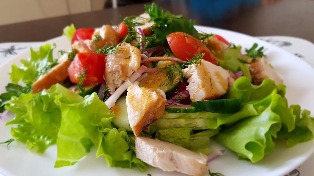 Ингредиенты: Филе куриное-400гр, капуста пекинская-200гр, помидоры-4шт, яйца-2шт, огурец-1шт, перец сладкий-2шт, йогурт натуральный-200гр, масло оливковое-2ст.л, соль, перец-по вкусу. Приготовление: Куриное филе нарезать на не слишком толстые кусочки (каждый весом примерно 100г). Слегка отбить молоточком. Посолить и поперчить. Обжарить на сковороде в 1 ст.л. оливкового масла до готовности. Снять мясо со сковороды и дать остыть. Пекинскую капусту (только листья) порвать на кусочки. Огурец и сладкий перец нарезать соломкой. Выложить овощи на капусту, приправить по вкусу. Куриное филе нарезать на длинные полоски. Выложить к овощам. Приготовить заправку: смешать натуральный йогурт, 1 ст.л. оливкового масла, соль и перец. Полить заправкой овощи и курицу, выложить на салат нарезанное отварное яйцо и дольки помидоров. Приправить по вкусу. Сразу подавать к столу. Приятного аппетита!