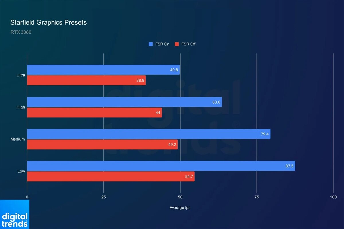 Авторы сайта Digital Trends опубликовали результаты технических тестов космической RPG Starfield на семи современных видеокартах. Чуда ждать не стоит: истории про “оптимизацию” — не более, чем проплаченная реклама. При этом нельзя сказать, что игра как-то сильно статтерит или фризит — это не так. Но для того чтобы получить стабильные 60 FPS в народном разрешении FullHD, нужна видяха не менее RTX 4070! Конечно, если речь идет о выключенной технологии FSR 2. “Каждая из графических настроек в Starfield автоматически включает FSR 2. Пресет «Ультра» использует разрешение рендеринга 75 %, «Высокий» использует разрешение рендеринга 62 %, а «Средний» и «Низкий» используют 50 %. Эти изменения оказывают огромное влияние на производительность”. А если вы хотите поиграть в 4К да в 60 кадров, то вам не хватит даже RTX 4080.