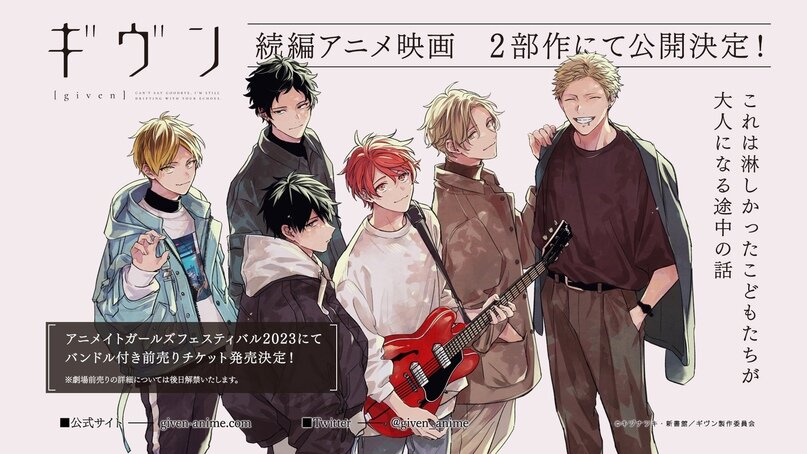 Стало известно, что полнометражный фильм-сиквел «Given» будет состоять из двух частей. Пока без подробностей.