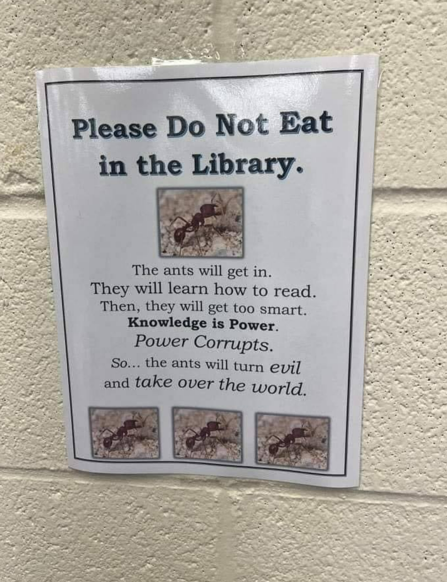 Please do not eat in the library. - Пожалуйста, не ешьте в библиотеке. The ants will get in. - Вовнутрь проберутся муравьи. They will learn how to read. - Они научатся читать. Then, they will get smart. - Затем они поумнеют. Knowledge is power. - Знание (знания) - сила (власть). Тут игра слов, power - многозначное слово. Power corrupts. - Власть - коррумпирует (развращает). The ants will turn evil and take over the world. - Муравьи станут злыми ("перейдут на сторону тьмы", "плохих") и захватят мир. С 1 сентября!