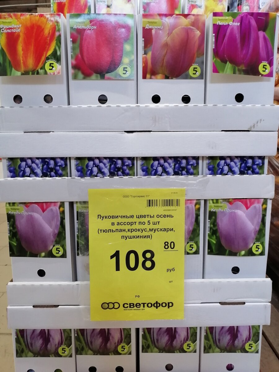 Всем привет! В магазин Светофор привезли луковичные цветы осенние в ассортименте. 5 штук. В наличии есть тюльпаны, крокус, мускари, пушкиния. Производитель Россия. Тельняшка мужская с начесом. Изготовлена из 100% хлопка. Размеры в ассортименте С 48 ПО 58. Изготовитель Узбекистан. Цена 299,90 Ящик перфорированный для хранения. Можно использовать для хранения овощей. Изготовлен из прочного пластика. Объем 48 литров. Производитель Россия. Такие ящики привозят каждую осень и их очень быстро разбирают. Цена 263 рубля. Жидкое мыло для рук ПрофЗаря с ароматом яблока. Объем 5литров. Имеет антибактериальный эффект, эффективен даже в холодной воде. ООО ПрофЗаря, Россия.