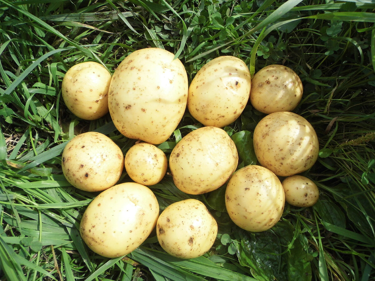 В этом сезоне я, наконец-то, купила для посадки семенной картофель для пробы. Обычно мы сажаем свой картофель, который оставляем на семена. Но его надо иногда обновлять. Вот я и решила начать. Купила весной, совсем немного, семенного картофеля, оказался сорт "Гала". Продавец семенного сказала, что его берут хорошо. Решила посадить в саду. Но так как в саду мало свободного места, взяла всего 30 картофелин. Под посадку своего семенного картофеля мы арендуем землю, сотки две у соседей, через дорогу от нашего сада. Сначала взяла сорт "Гала" для посадки, а только потом решила прочитать о нём в интернете. У меня так бывает. Семенной картофель был уже с ростками. Посадила я 30 картофелин в саду не на самом плохом месте. В лунки добавляла немного перегноя, древесной золы, яичной скорлупы. Взошёл картофель хорошо и рос хорошо, но не цвёл. А это фото ботвы картофеля сделано 25 августа. Для пробы выкопала два куста. В каждом кусту было по шесть картофелин. А это мытый картофель. Выглядит