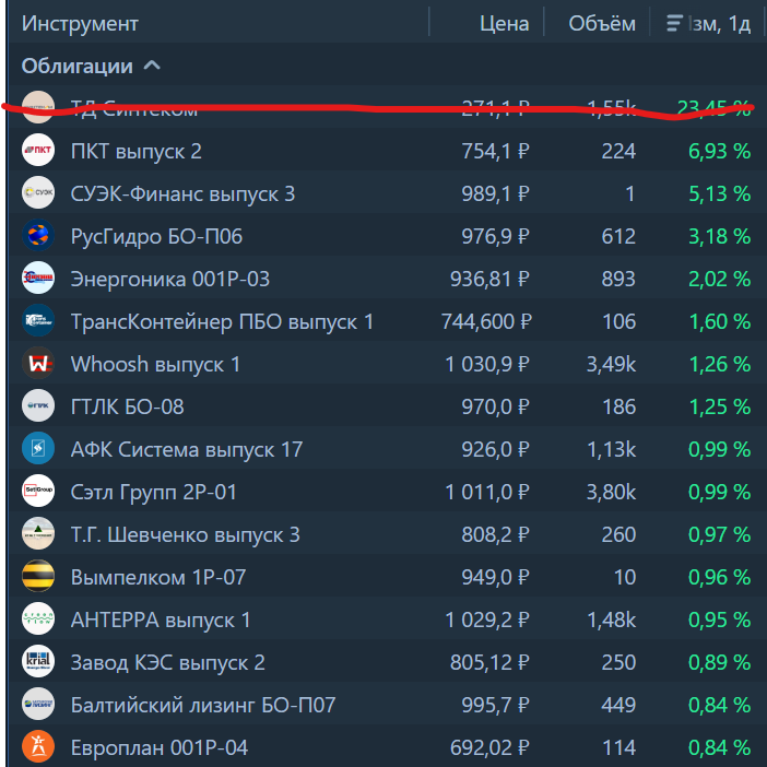 🔸Совесть не позволяет мне оставить Синтеком в топах роста дня, поэтому на него наложена сочная красная линия :) Остальные движения перед вами, в целом облигационный рынок немного ожил. В падениях ничего критичного, обойдемся перед выходными без него :) Отмечу лишь, что крайне справедливо едут вниз ЦЕНТР-РЕЗЕРВ БО-01 $RU000A1056T2 и первый выпуск ОЗОНа (фармкомпании) $RU000A1060X6.
