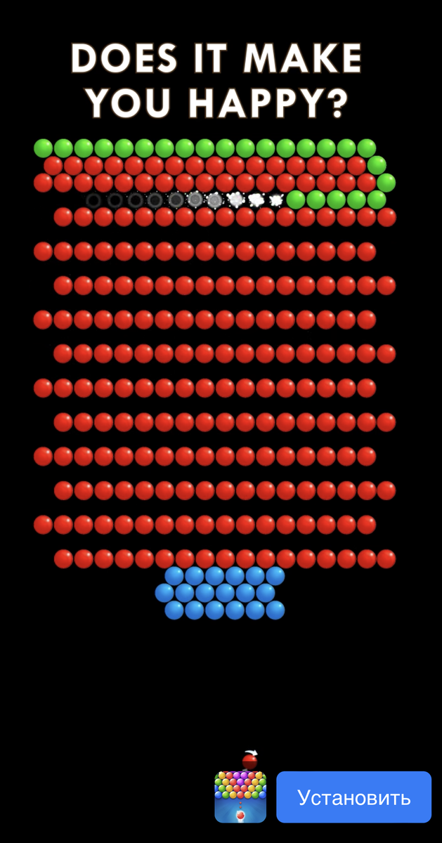 Сегодня взбесил очередной анонс. На английском языке меня спрашивают: "Это делает тебя счастливым?". Предполагаю, что идея разработчиков в том, что если я загружу этот шедевр инженерной мысли и смогу отправить шарики в нужном направлении, то ко мне подкатит на золотой карете это самое счастье. И все тяготы и заботы спрячутся.