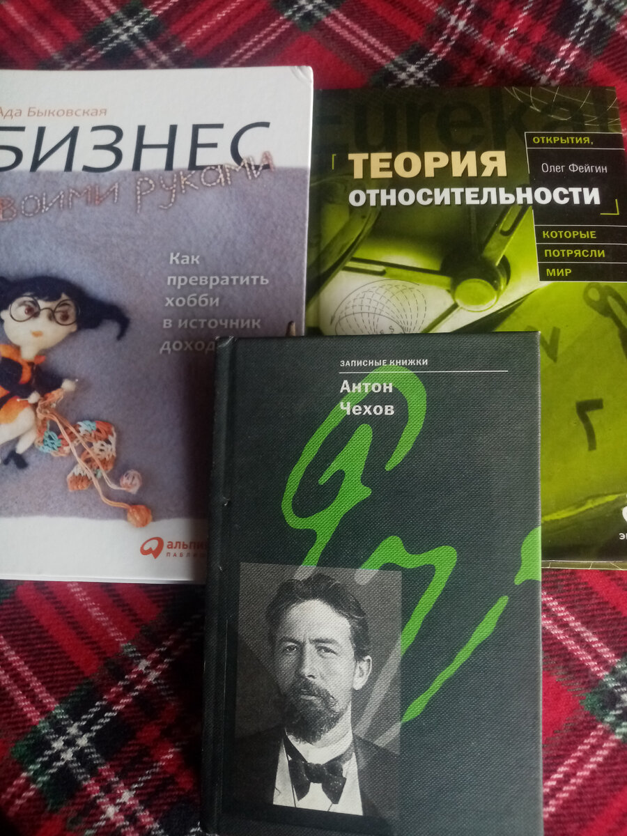 Вот книжечки, которые, возможно, скоро покинут мой дом. "Записные книжки" Чехова в ближайшее время отправятся в буккроссинг. "Теорию относительности" и "Бизнес своими руками" отнесу в библиотеку, она в соседнем доме, и там нонфикшн почему-то берут с удовольствием. Я всегда пролистываю книги перед расставанием, и вот здрасьте - "Бизнесом" так увлеклась, что до библиотеки он, кажется, доберётся не раньше, чем я его перечитаю от корки до корки. Первый раз читала пять лет назад, в основном призабыла, но помню, что книга стоящая. Те рекомендации, ради которых я её купила, теперь менее актуальны, зато могут "выстрелить" другие. О, точно, перечитаю да и сделаю обзор. Вообще о ней много отзывов на разных площадках, я и заказала-то её в своё время "по рекомендации". Ну ладно, сейчас торжественные проводы Чехова. Он в свои записные книжки заносил подслушанные колоритные разговоры и отдельные словечки, свои мысли и идеи будущих рассказов и водевилей, имена и фамилии для будущих персонажей - по