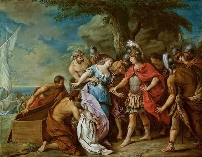 Начинается легенда о Персее рассказом о судьбе его матери. Узнав, что по предсказанию его внук убьёт её, отец красавицы Данаи поместил её в подземный дворец, чтобы скрыть её от чужих глаз. Но великий Зевс полюбил её и, пролившись золотым дождём, подарил ей сына. Когда же тиран-отец увидел с ней ребёнка, он приказал поместить мать и дитя в ящик и бросить его в море. Как и в известной нам «Сказке о царе Салтане», их выбросило к берегу острова Сериф, где рыбак, увидевший их, отвёл к местному правителю. Царь Полидект разрешил матери и сыну поселиться у него.