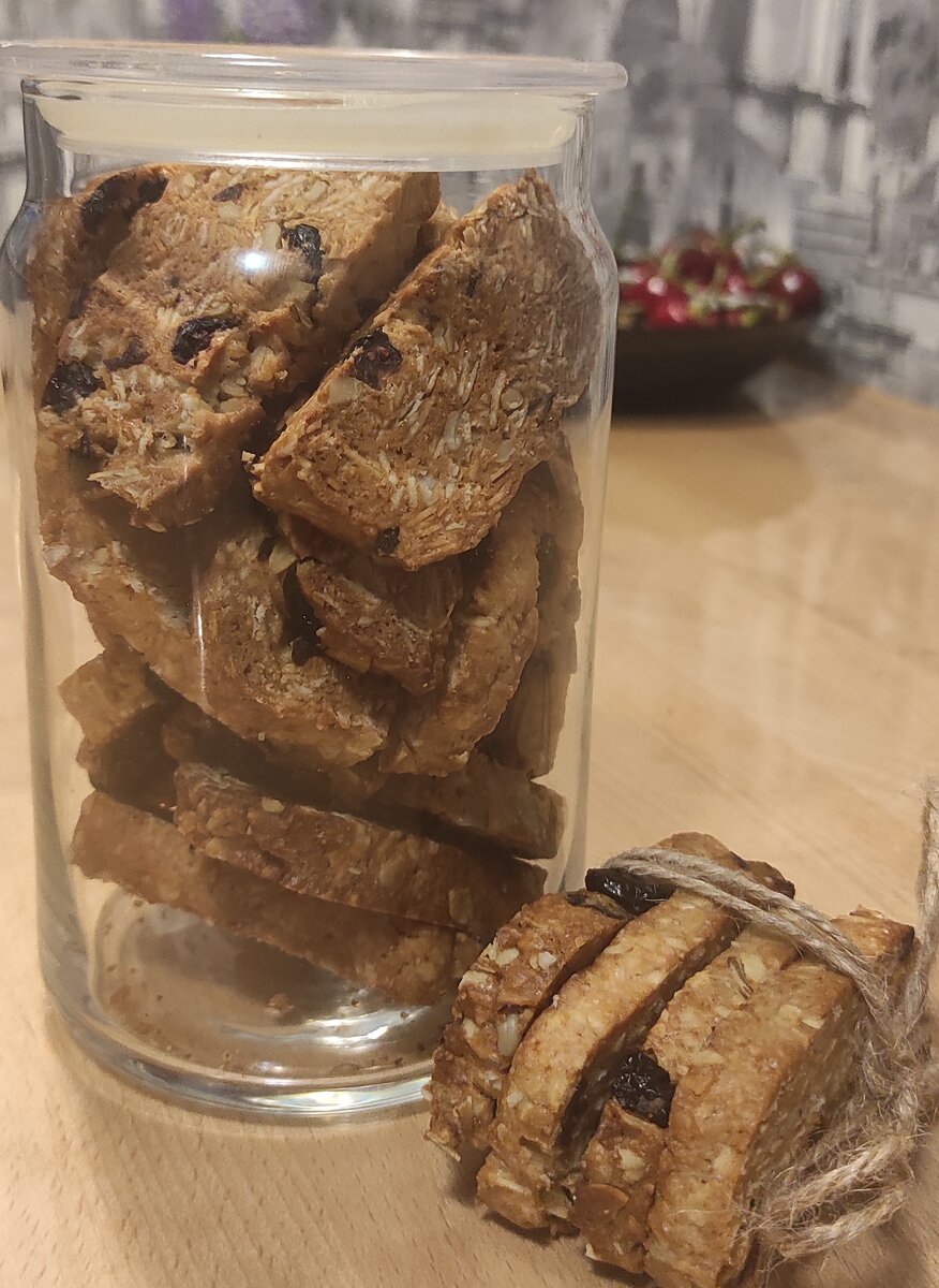 Привет, друзья. Нашла на просторах интернета рецепт интересного печенья с секретным ингредиентом - яблочное пюре. Меня рецепт заинтересовал. Решила его опробовать, мне очень понравился результат. Делюсь своим опытом с вами. Ингредиенты: 110 гр. яблочного пюре (у меня яблоко, натертое на мелкой терке), 100 гр. сахара, 100 гр. кокосового масла (можно использовать любое растительное масло или сливочное), 200гр. муки пшеничной высшего сорта (можно частично заменить цельнозерновой), 125 гр. овсяных хлопьев, 10 гр. ванильного сахала, 1 ч.л. разрыхлителя, 30 гр. кокосовой стружки, 50 гр. миндальных лепестков, 50 гр. любых орехов (у меня - семечки подсолнечника), 50 гр. сушеной клюквы (можно вишню, финики, чернослив и т.д. по вкусу и желанию). Всего добавок 180 граммов, любых по желанию. Все смешать, сформовать в бруски, завернуть в пленку и поместить в морозилку на 2-3 часа (получаются заготовки, их я храню в морозилке и выпекаю по мере необходимости). Заготовки я достаю их морозилки, о