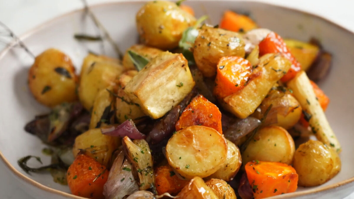 Для этого блюда подойдут любые овощи, которые, есть под рукой, можно запечь в духовке. Однако есть нюанс – нужно запекать крахмалистые и более жёсткие корнеплоды отдельно от овощей с высоким содержанием влаги, как баклажаны (овощи с высокой влажностью лучше запекать отдельно на сильном огне, чтобы они быстрее покрылись корочкой и сохранили влагу). Чтобы не подгорел чеснок -используйте целые зубчики чеснока в кожуре придавленные ножом, а не измельчённые. Во время приготовления чеснок отдаст прекрасный чесночный аромат всем овощам, а целый запечённый чеснок имеет хороший вкус в отличие от давленного через чеснокодавку. Травы при запекании овощей лучше использовать свежими веточками (рубленные могут подгореть) шалфей, тимьян или розмарин, которые хорошо придают аромат (сушёные травы тоже подойдут, но они не дадут того аромата, который дают свежие травы). Более нежные травы, как орегано, базилик и т.д., не выдерживают длительного приготовления в духовке, вянут и теряют свой аромат. Их м