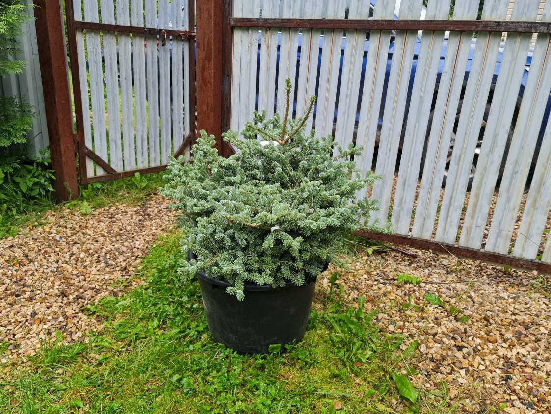 Также в июле у меня был день рождения и традиционно сочувствующие моему садовому диагнозу дарят мне какое-нибудь растение. Ту самую пихту, которая была нужна, они тоже не смогли достать, но не растерялись и презентовали мне альтернативное растение - пихту корейскую Блю Эмперор (Blue Emperor).