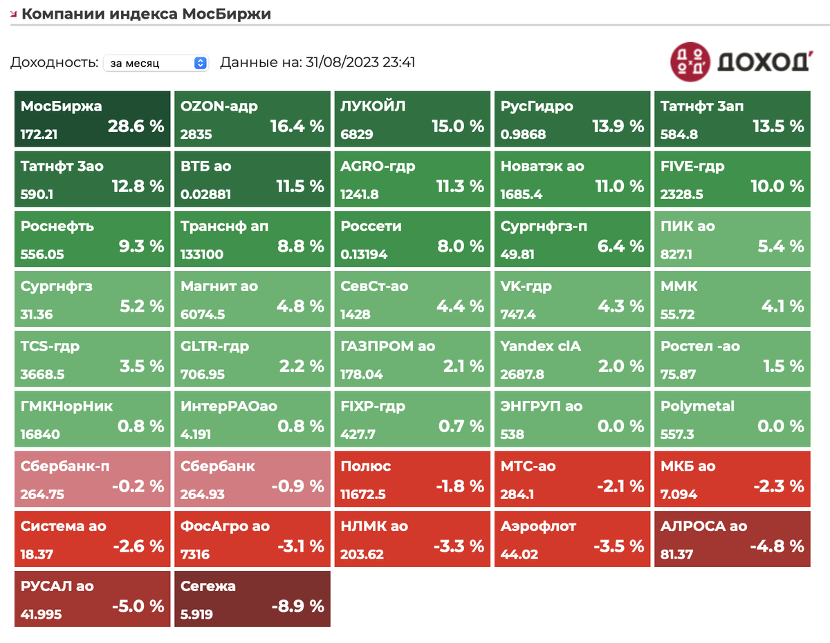 Доходности акций РФ за август