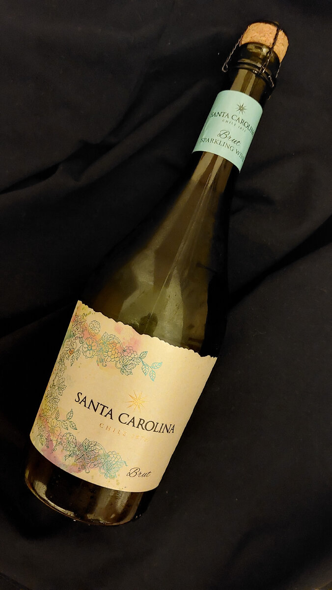 Некоторое время назад я писал на канале про вина этого винного хозяйства. Розе было очень хорошим. Я также пробовал их Каберне Савиньон, оно вообще ТОП. Интересным и типично чилийским получился Совиньон Блан. Зато сегодня я представляю другой обзор, игристое от Санта Каролина: Santa Carolina brut. Бутылка типичная для игристого: темное толстое стекло, форма "Шампань", относительно добротное мюзле и большая натуральная пробка. Хотя, забегая вперёд, пробка не такая уж и большая, и позднее становится ясно почему. Фронт этикетка выполнена в схожей с корпоративной стилистикой манере, воздушные цветочные узоры с разноцветным толи дымом, толи акварельной краской. В целом свежо, ярко, легко и современно. Но почти никакой информации на ней нет. Из контрэтикетки мы понимаем, что вино из Шардоне, на 100 %. При этом основная информация от производителя размещена необычно, на этикетке на горлышке. Тут же видно, что вино спуманте, т.е. сделано по технологии Шарма, а не по классической технологии. Х