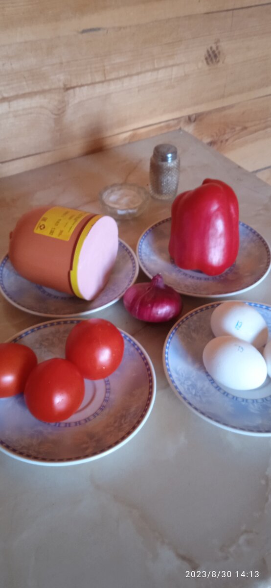 Берём- помидоры, перец болгарский, лук, яйца ,соль и колбасу.