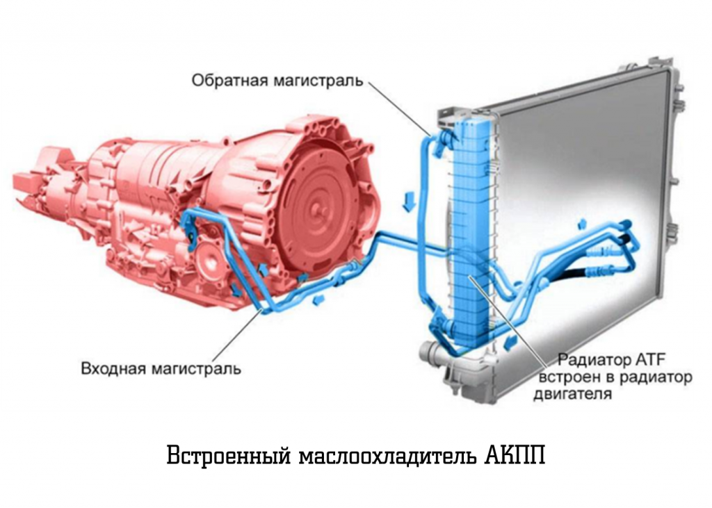 От состояния, уровня и свойств ATF — напрямую зависит срок службы и качество работы автоматической коробки передач. АКПП, в отличие от механической коробки передач, подвергается более серьёзным нагрузкам. В процессе работы через ATF осуществляется передача крутящего момента в гидротрансформаторе, масло под давлением подается по каналам гидроблока, и в результате жидкость достаточно сильно нагревается. Поэтому в АКПП существует принудительная система охлаждения: 1. Маслонасос , который нагнетает масло под давлением и прокачивает трансмиссионную жидкость от движущихся элементов и деталей коробки в маслоприемник; 2. Маслоприемник, который находится в поддоне АКПП или в радиаторе автомобиля (в зависимости от схемы реализации); Теплообменник для трансмиссионного масла (масляный радиатор АКПП, он же маслоохладитель АКПП) на разных моделях авто может отличаться. На большинстве автомобилей охладитель АКПП находится прямо в корпусе радиатора системы охлаждения двигателя. Это позволяет упростит
