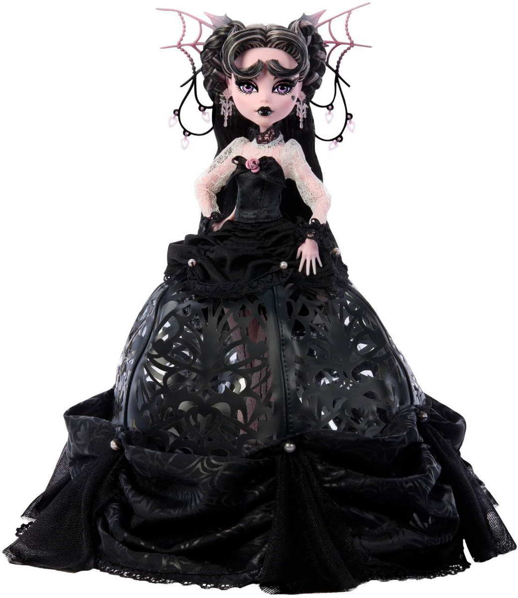 На мой взгляд это удачный выпуск куклы. Мне безумно понравилась Дракулаура по промо фотографиям, выглядит очень готически и завораживающе. Как по мне, ей идет такой стиль и он очень соответствует ей как вампиру. Цена этой красавицы конечно дорогая, стоимость этой куклы составляет $100.00, кусачая конечно цена. Одета она в потрясающее пышное платье черного цвета. У нее пышный низ, пышные рукава. Платье интересно тем, что в нем есть вырезы в виде сердец и различных узоров, низ украшен тканью с маленькими жемчужинками. На корсете можно заметить маленькую розовую розу. Сзади платья черный бант. Дракулаура очень элегантна в этом наряде! Сама кукла также в белых кружевных колготках. Туфли у Монстр Хай всегда как отдельное искусство. Каблук в виде винтовой лестницы, на которой красуется статуя летучей мыши, как можем заметить каблук полупрозрачный, когда основная туфля черная, на ней также черные маленькие бантики. Ее прическа очень интересна и скажу, что ей подходит, мне даже нравится эта