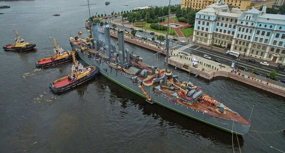 Крейсер «Аврора» пришвартован на вечной стоянке у Петроградской набережной в Санкт-Петербурге. Он стоит у истока Большой Невки.