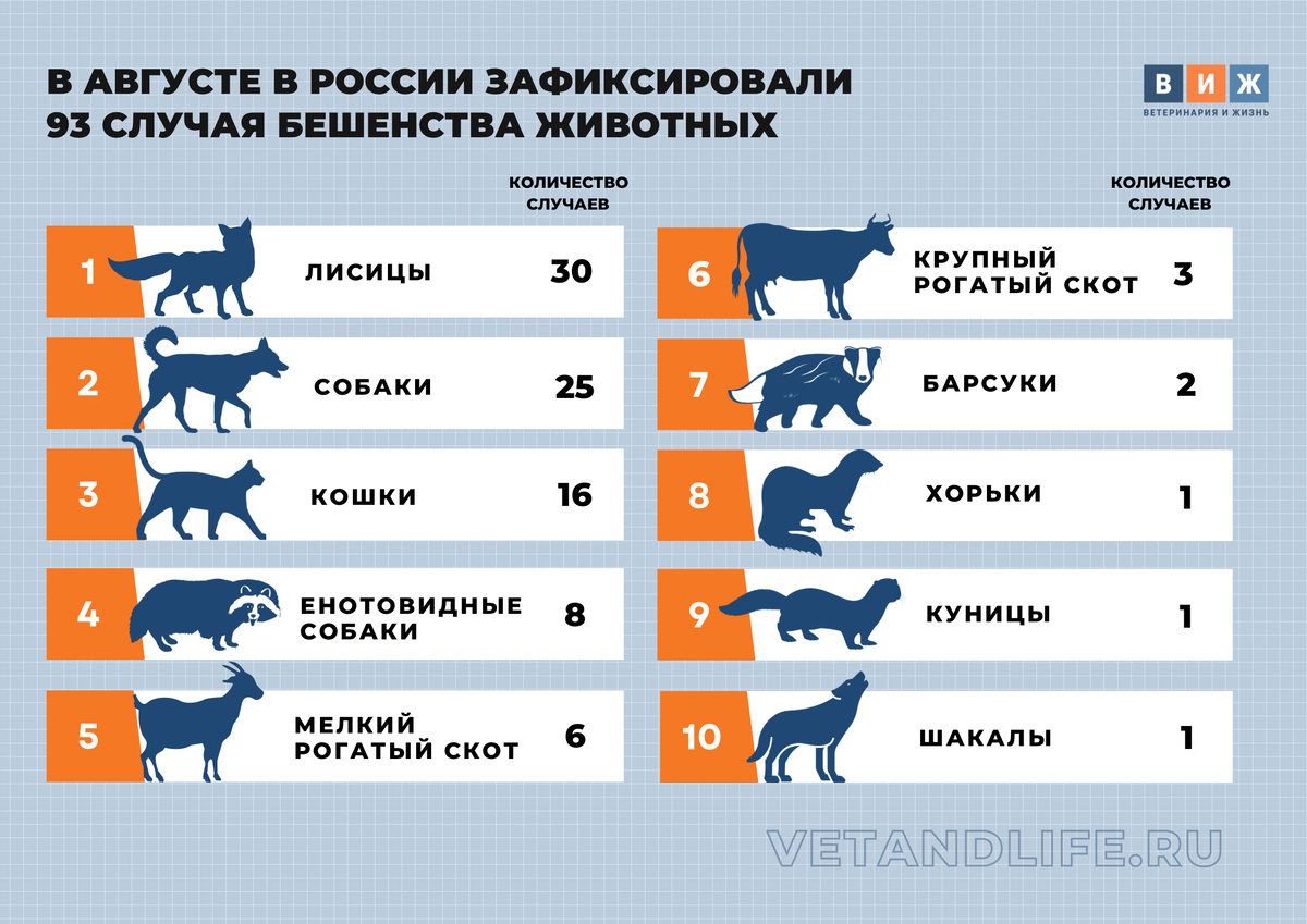 По данным информационной системы Россельхознадзора «Сирано», в августе 2023 года в нашей стране зафиксировали 93 случая бешенства среди животных. Об этом сообщили в пресс-службе Федерального центра охраны здоровья животных (ФГБУ «ВНИИЗЖ» Россельхознадзора). Больше всего случаев бешенства в августе выявили в Смоленской, Тамбовской, Свердловской, Белгородской, Воронежской, Московской, Новосибирской, Рязанской, Тюменской и Саратовской областях. Чаще всего бешенство отмечалось у лисиц – 30 случаев, собак – 25 случаев и кошек – 16 случаев. Также в прошлом месяце вирус 8 раз выявляли у енотовидных собак, 6 раз – у мелкого рогатого скота, 3 раза – у крупного рогатого скота и 2 раза – у барсуков. По 1 случаю бешенства зафиксировали у хорька, куницы и шакала. Справка «ВиЖ» Бешенство – инфекционное заболевание, вызываемое вирусом Rabies virus, опасное для животных и людей. Бешенство приводит к тяжелому поражению центральной нервной системы, характеризуется водобоязнью, светобоязнью, агрессивны