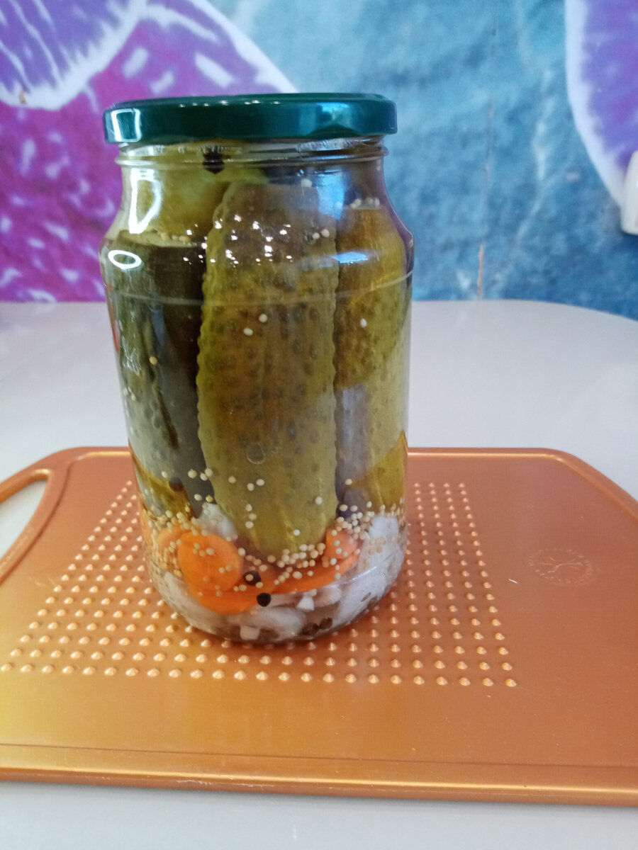 На 1-литровую банку понадобится: 1 столовая ложка сахара с горкой 1 столовая ложка соли без горки 1 столовая ложка 9% уксуса 1 лавровый лист 10-15 горошин перца 1 небольшая луковица 1 чайная ложка зерен горчицы Несколько кружочков очищенной сырой моркови Лук нарезать кружочками. Положить на дно банки. Выложить туда же перец, лавровый лист, нарезанную кружочками морковь В банку плотно уложить огурчики, насыпать в нее сахар, соль. Залить банку кипятком, добавить туда же уксус . Поставить стерилизовать. Стерилизовать в течение 10 минут с момента закипания. Приятного аппетита. Спасибо, что прочитали мою статью.