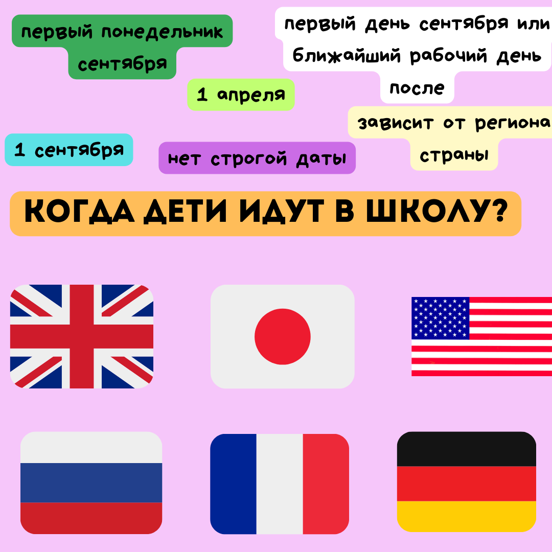 Привет! Вот и наступил сентябрь, а с ним - учебный год. У нас в школе всегда 1 сентября была линейка - неважно, какой день недели. Однако мы узнали, что в других странах все немного иначе. Готовы тоже узнать? Предлагаем сначала почитать интересные факты о дне знаний в других странах, а после этого можете выполнить небольшое задание. Когда же дети идут в школу? Задание Теперь, после того как вы узнали столько интересного, предлагаем выполнить небольшой тест. Сопоставьте флаги стран с днем начала учебного года. Ваши ответы ждем в комментариях! Всем успехов!