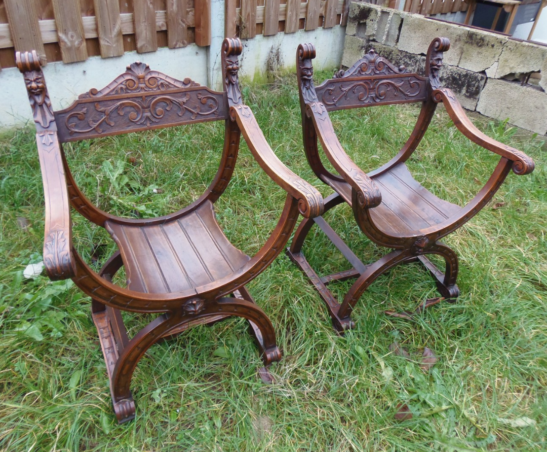 Курульное кресло - это удобное и роскошное кресло с высоким спинкой и подлокотниками. Оно имеет обычно овальную или ромбовидную форму и часто украшено резьбой, инкрустацией и драгоценными материалами, такими как мех, шелк или бархат. Курульные кресла были популярны в королевских дворцах и аристократических резиденциях в 18-19 веках. Сегодня они могут использоваться как предметы интерьера в роскошных домах или гостиницах. Стиль приведенных здесь кресел - ренессанс.