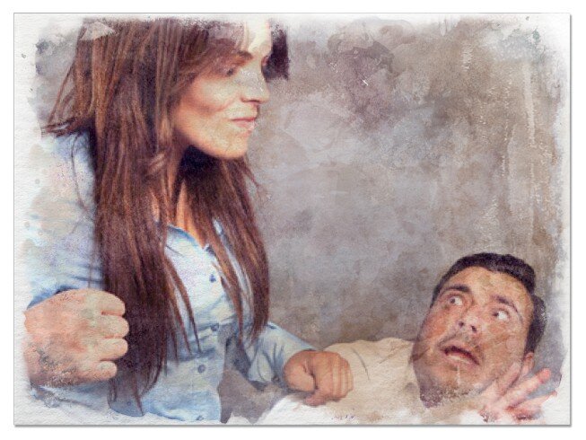 И Гена, который любил свою жену, поехал. Когда он вошел в квартиру, Катя сразу же подошла к нему, дочка спала. Она начала его целовать и обнимать, он даже не успел ни о чем подумать, Катя уронила его на диван. Потом, пока он лежал и отходил от всего происходящего, девушка ушла. Она вернулась, улыбнулась. А потом начало происходить ужасное. Катя села на пол, взяла молоток, и ударила себя по руке. После молотка пошел нож, она два раза ткнула им себе в руку, при этом орала так, что проснулся ребенок.