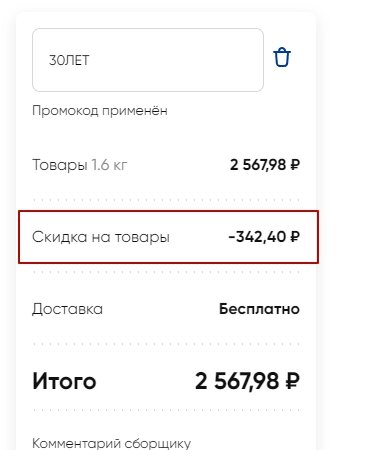 - Перейти в корзину товарв и в поле "Есть промокод?" ввести скопированный выше промокод