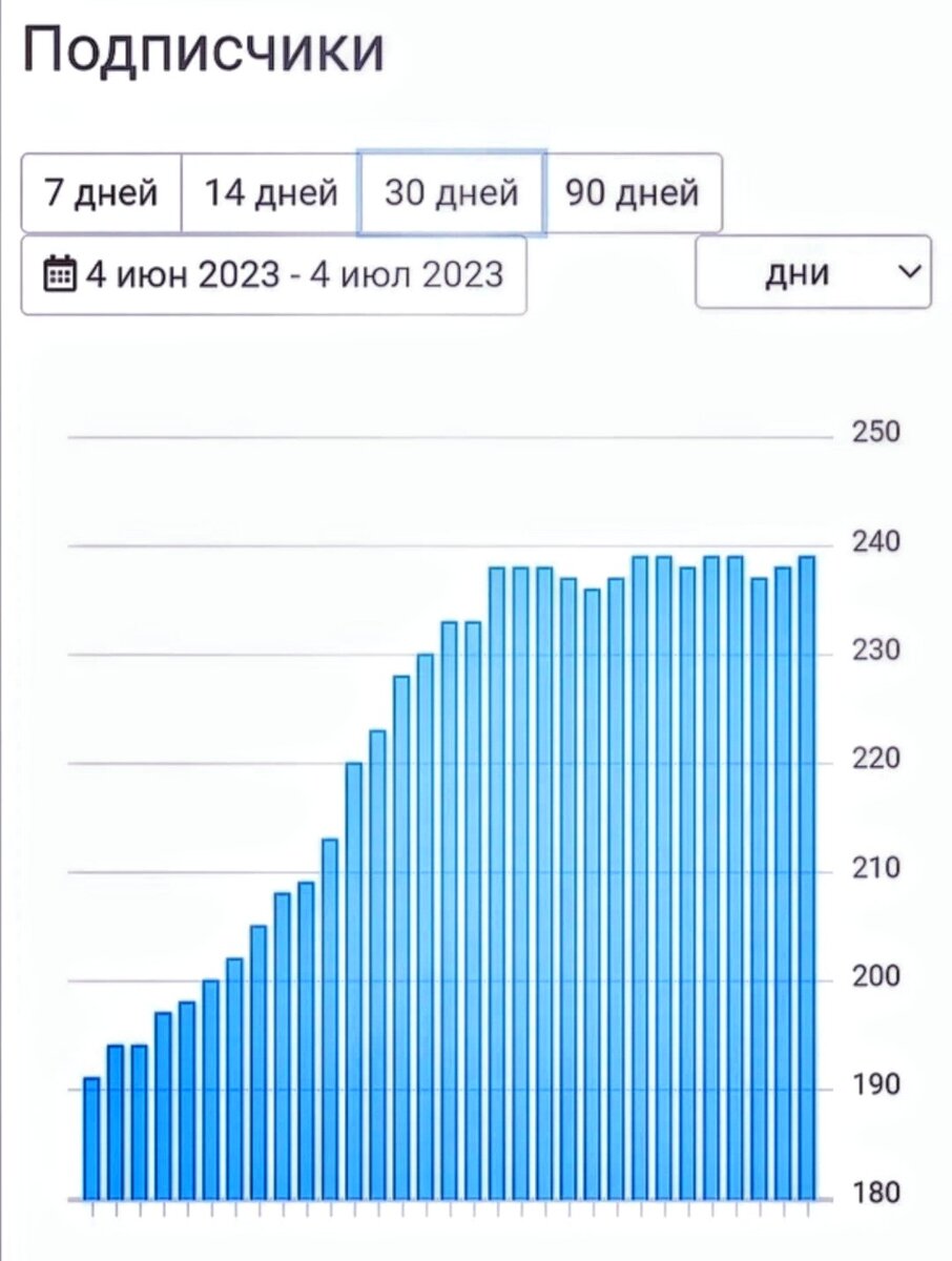 Несколько интересных наблюдений у меня накопилось после анализа статистики Дзена. О некоторых я уже написала. Про них можно прочесть в этой подборке: Но есть и те, которые я ещё не озвучила. Как только Дзен убрал "активных подписчиков" из статистики, то тут же количество подписчиков стало расти. Давайте все это покажу в динамике, на графиках. Примерно до 15 июня (предполагаю, что это момент, когда Дзен принял решение изменить монетизацию) рост подписчиков был стабильным. Вот тут статистика по подписчикам моего канала с 4 июня по 4 июля: Потом резко застопорился на одном месте. Полтора месяца число подписчиков было стабильно 238-240 человек. Если был бы график за этот период, то он был бы ровным. Горизонтальной прямой, а не врсходящей. Затем, после 3 августа, когда была введена новая монетизация, их число опять стало стабильно расти. А это график с 3 августа по 2 сентября: О чем это говорит? Да просто на программном уровне в тот момент было нивелировано и застопорено число подп