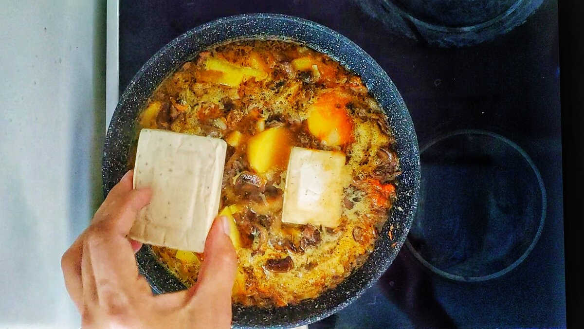 Когда хочу устроить день без мяса, то в ход идут грибы. Тем более, что в 2023 году в Сибири урожаище. Забила уже всю морозилку, делюсь с вами простым и очень быстрым рецептом. С вами Женя, автор канала "Булошная", и я искренне рада видеть вас на своем уютном канале. Будем готовим для своих любимых? Поехали! Для начала разогрейте сковороду и налейте немного растительного масла. Половину репчатого лука мелко нарежьте и обжарьте в течение 5 минут, пока не зарумянится. Одну среднюю морковь натрите на мелкой терке и отправьте к луку. Поджарьте еще 3-4 минуты. Именно натертая на мелкой теркеморковб дает красивы цвет супу и "теряется" в общей массе 300-400 граммов свежих шампиньонов нарежьте и бросьте в сковороду. Пока овощи тушатся с грибами, Возьмите 4 картофелины, 3 из них порежьте картофель на брусочки, а одну - пополам. Брусочки вот такого размера. Добавьте в сковородку картофель и 1/2 столовой ложки соли. Варим! Налейте 2 стакана воды. Доведите до кипения и варите в течение 20-ти