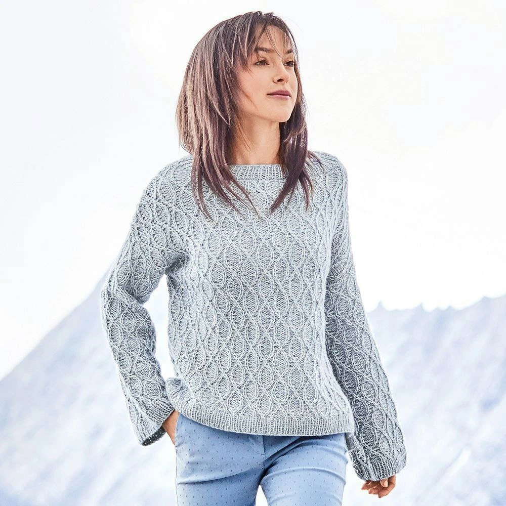 Размеры 38/40 (44/46) ВАМ ПОТРЕБУЕТСЯ Пряжа (60% шелка, 40% натуральной шерсти; 150 м/50 г) — 350 (400) г голубой меланжевой; спицы №5; круговые спицы №4,5. УЗОРЫ И СХЕМЫ РЕЗИНКА Ряды в прямом и обратном направлении (нечетное число петель). Каждый ряд начать и закончить 1 кромочной. Лицевые ряды: попеременно 1 лицевая, 1 изнаночная, закончить 1 лицевой. Изнаночные ряды: петли провязывать по рисунку. Круговые ряды (четное число петель) = попеременно 1 лицевая, 1 изнаночная. УЗОР ИЗ СНЯТЫХ ПЕТЕЛЬ Число петель кратно 12 + 8 + 2 кромочные = вязать согл. схеме. На ней даны лицевые ряды. В изнаночных рядах петли провязывать по рисунку или согл. инструкции. Начать с 1 кромочной и петель перед раппортом, раппорт постоянно повторять, закончить петлями после раппорта и 1 кромочной. Постоянно повторять 1—16-й ряды. Обратить внимание на то, что в снятых петлях в вязаном полотне виден только каждый 2-й ряд. Плотность вязания 20 п. х 28 р. = 10 x 10 см. ВНИМАНИЕ Спинка на 3,5 см длиннее переда. Это